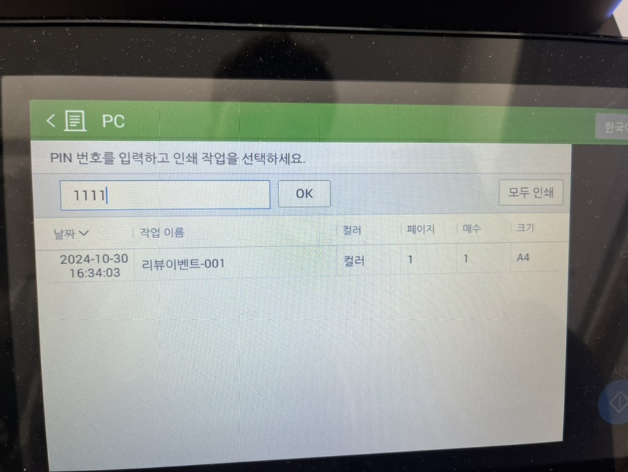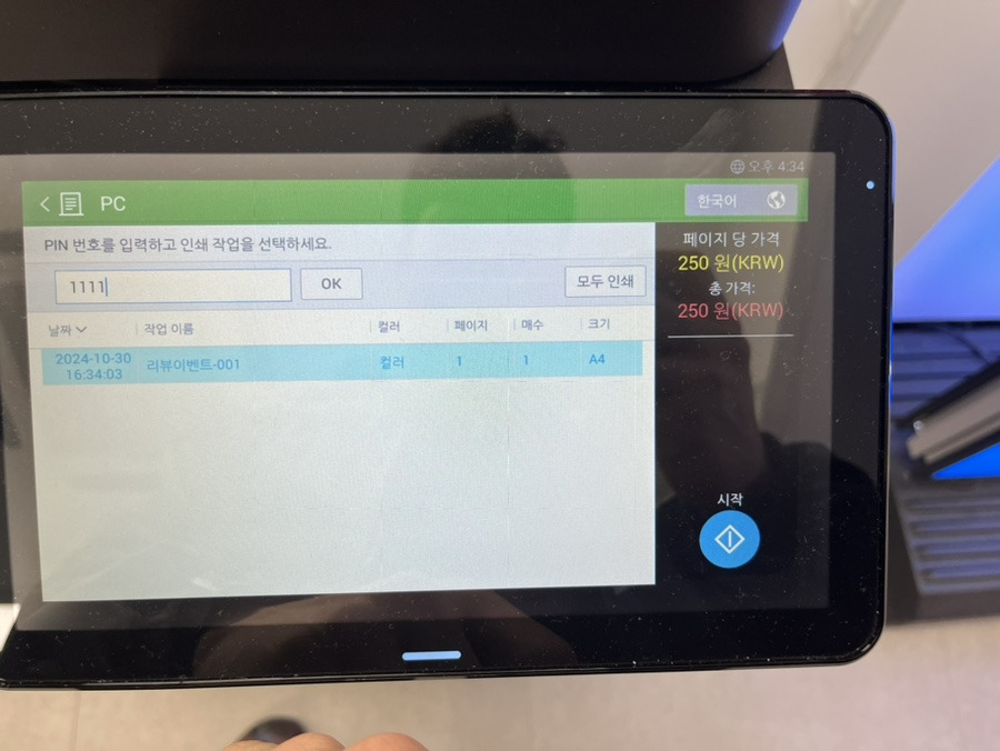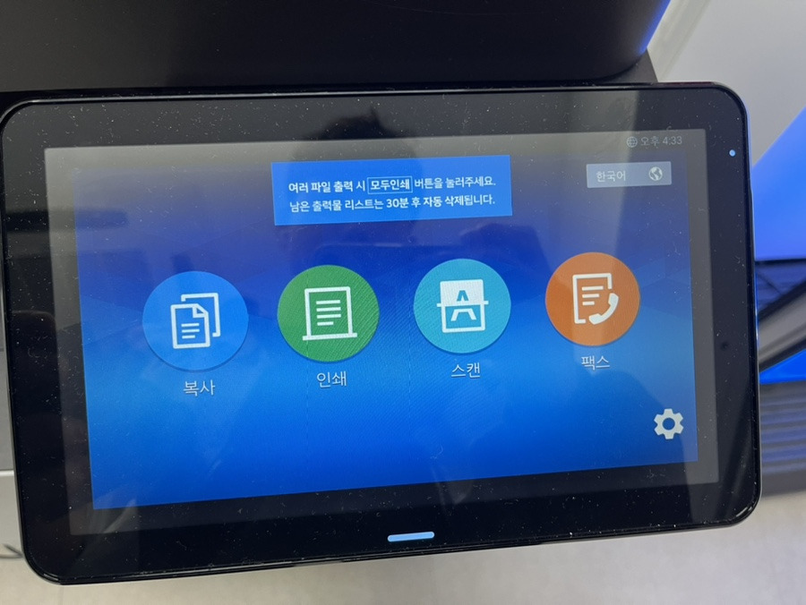 컴퓨터 바로 옆에있는 복사기로 가서 내가 하고자 하는 버튼을 누릅니다